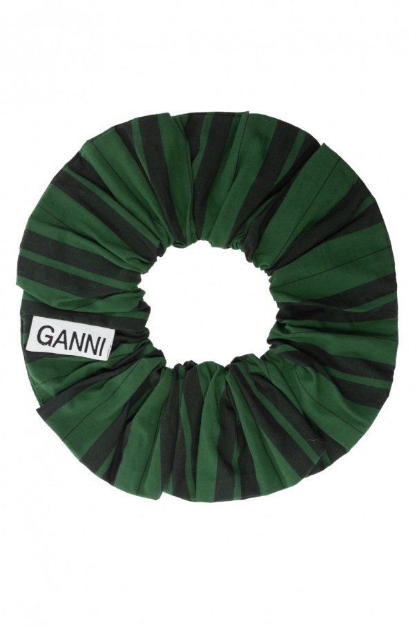Green scrunchie from Ganni. Crafted from organic cotton, this item showcases a black stripe pattern.