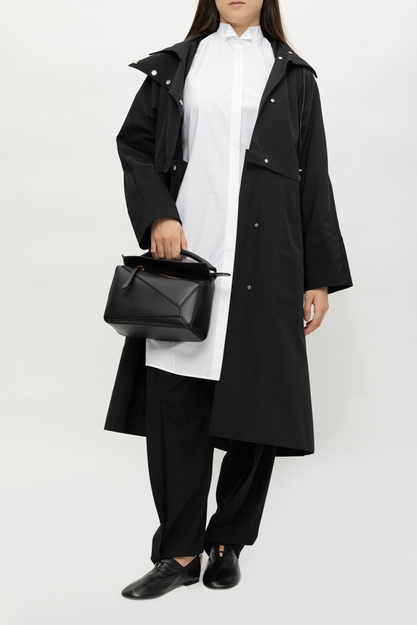 Black ‘Flamenco’ shoes from Loewe. Crafted from calf leather with a slip-on style, this model sits on a brown leather sole and features a back elastic trim accompanied by a canvas strap printed with a cream and black logo.