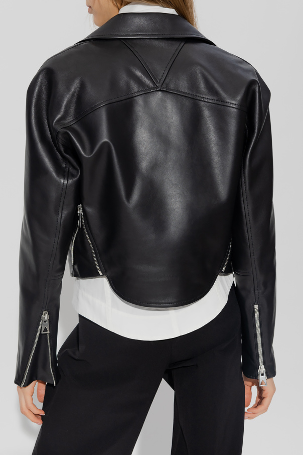 Black biker jacket from Bottega Veneta. Crafted from calf leather, this style features a zip fastening, notch lapels, with snap closures, three zip pockets, one snap-fastened pocket and an elasticated bottom hem and cuffs.