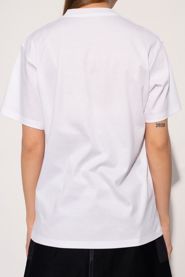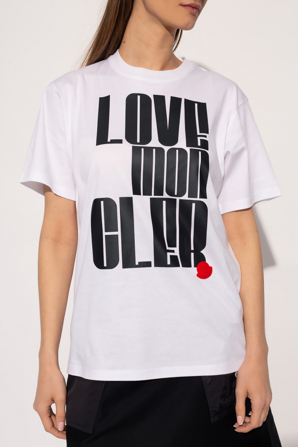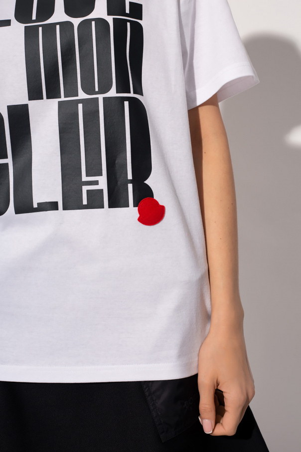 White crewneck T-shirt from Moncler. Made of cotton, this style features short sleeves and a black graphic print accompanied by a red patch on the front.