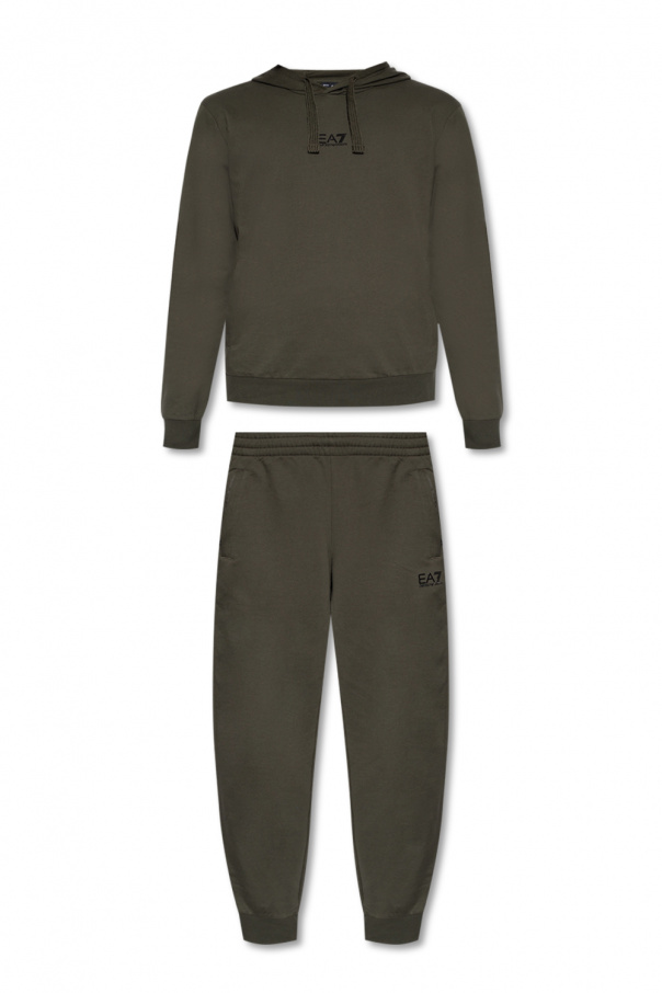 Dark green sweatsuit from EA7 Emporio Armani. Crafted from cotton and printed with the brand's logo in black, it includes a sweatshirt with a drawstring hood, a zip fastening and two slip pockets and sweatpants with a drawstring waist and two front zipped pockets and elasticated cuffs.
