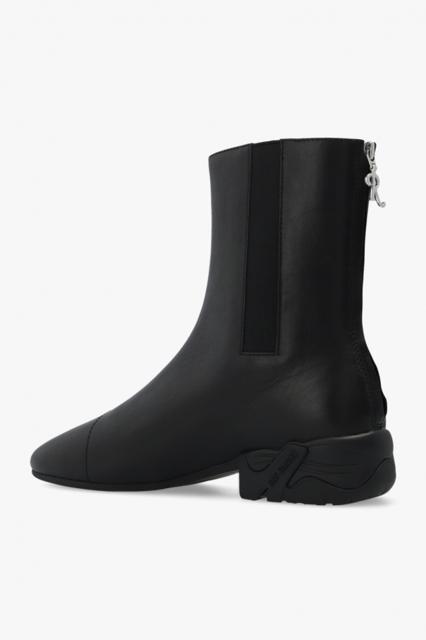Black ‘Solaris’ ankle boots from Raf Simons. Crafted from leather, this model sits on a black rubber sole and features a back zipper and an embossed white logo pattern.