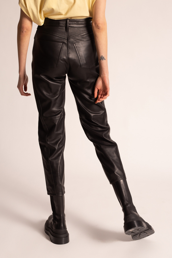 Black trousers from Iro. Made of lamb leather, this pair falls down with tapered legs and features classic five pockets and exposed stitching details.