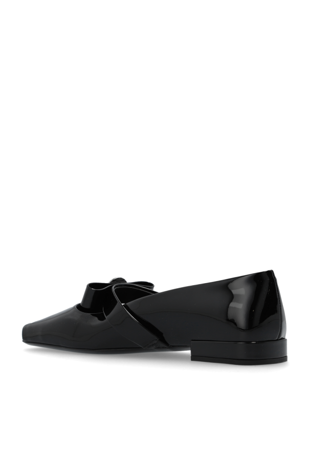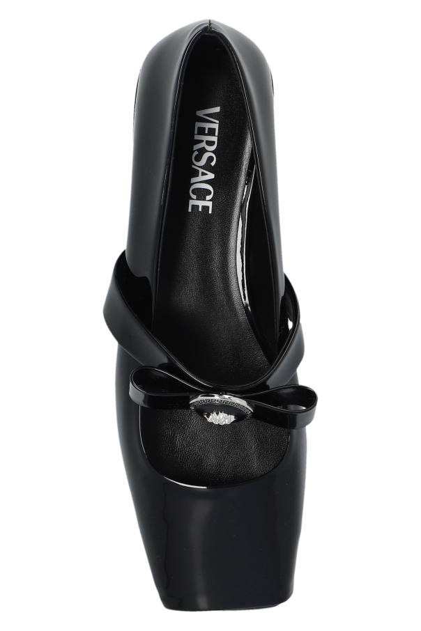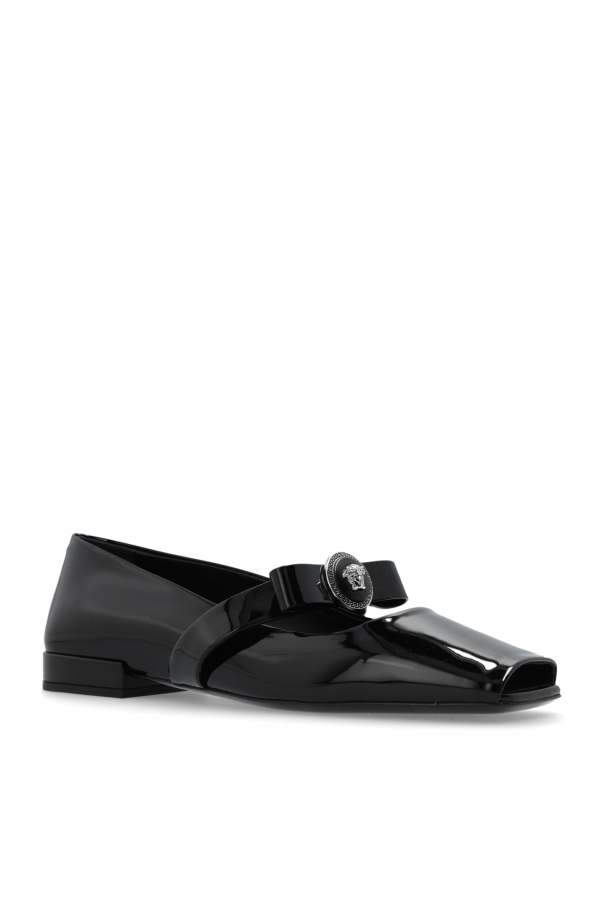 Black ‘Gianni’ ballet flats from Versace. Made of calf leather with a metallic finish, this design features a strap with a bow, Medusa head, square toe and a black leather sole.