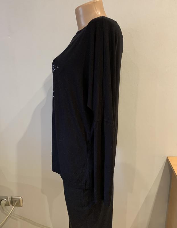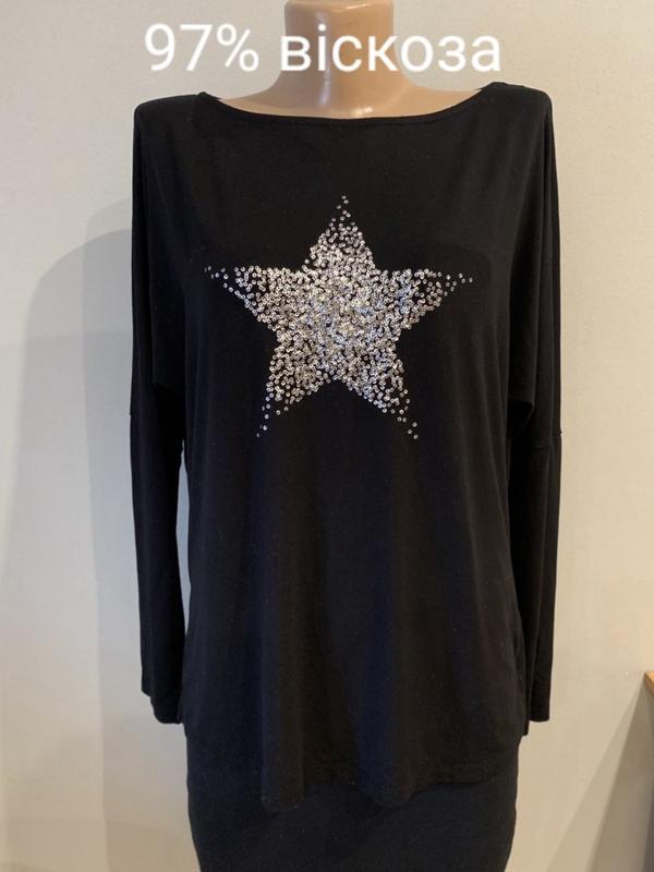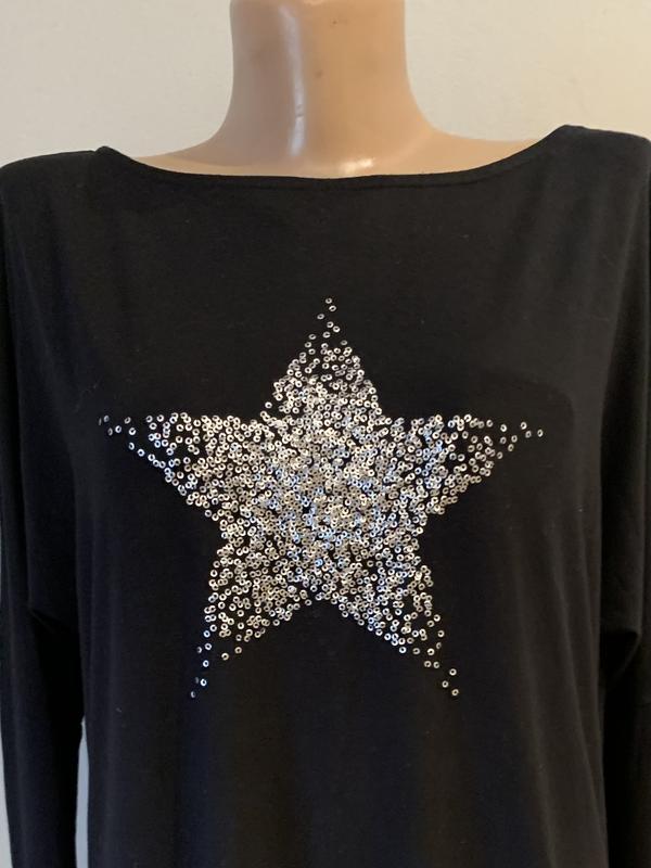 Стильный черный лонгслив, очень мягкий, приятный на ощупь трикотаж вискоза. Отделка- звезда из мелких серебристых пациенток. Очень эффектная, качественная, хорошо растягивается. Пог 64 см, ПО низу 51 см, длина 58 см, рукав от горловины 63 см