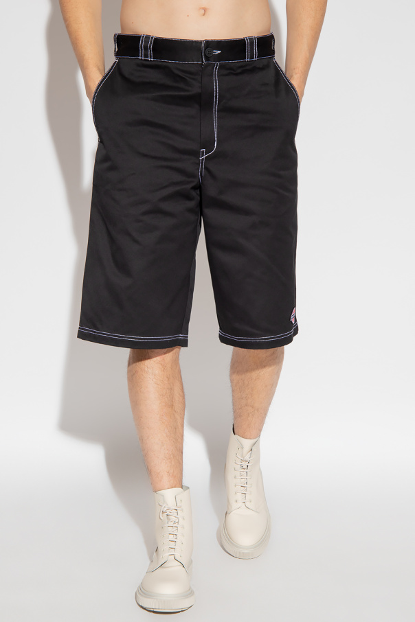 Black shorts from Heron Preston. Made of cotton, this pair features a zip and button closure, contrasting white seams, red and black logo patch, two front pockets and two back pockets.