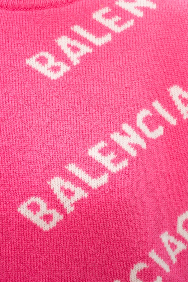 Pink sweater from Balenciaga. Knitted from wool with an oversize silhouette, this piece displays the brand's logo in white and features V-neckline and two slit pockets.