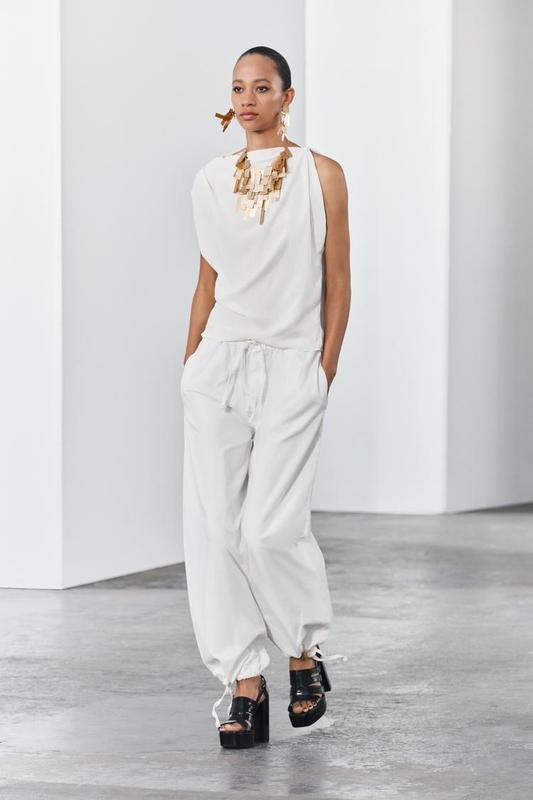 Топ с асимметричным верхом и одним коротким рукавом. Сборки на плечах.