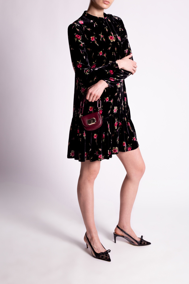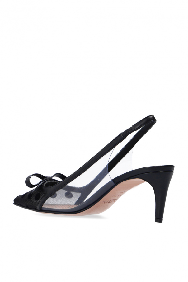 Black slingback pumps from Red Valentino. Crafted from leather and fabric with a pointed toe silhouette, this pair sits on a beige leather sole and showcases a bow and a geometrical pattern.