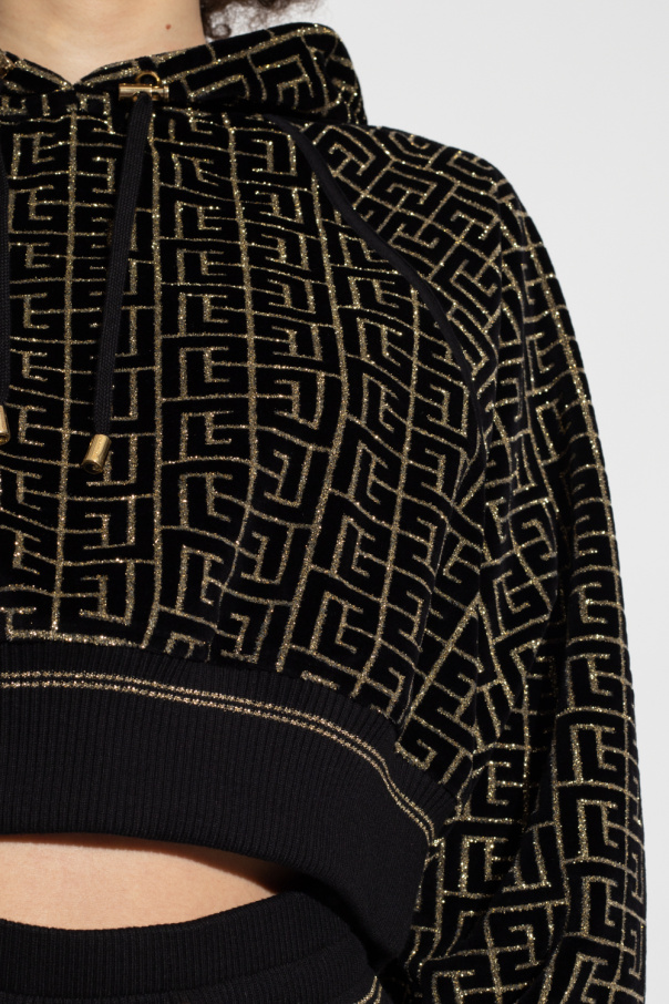 Black hoodie from Balmain. Made of cotton, this garment features a gold-tone monogram pattern, drawstring hood and ribbed trims at the hem and cuffs.