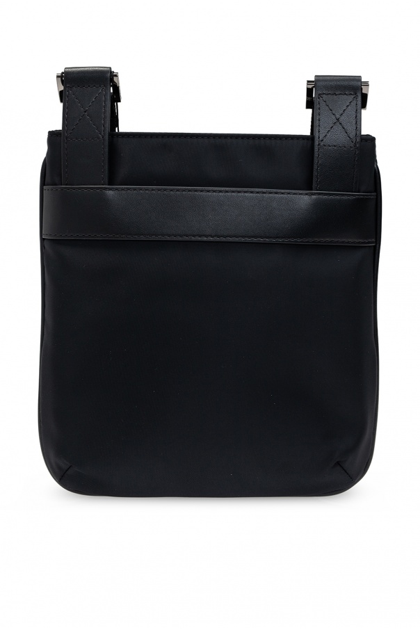 Black shoulder bag from Emporio Armani. Fastened with a zip, this design is decorated with a logo-embossed appliqué and complete with an adjustable shoulder strap, leather inserts, black metal hardware and one internal compartment with one slip pocket and one zip pocket.
