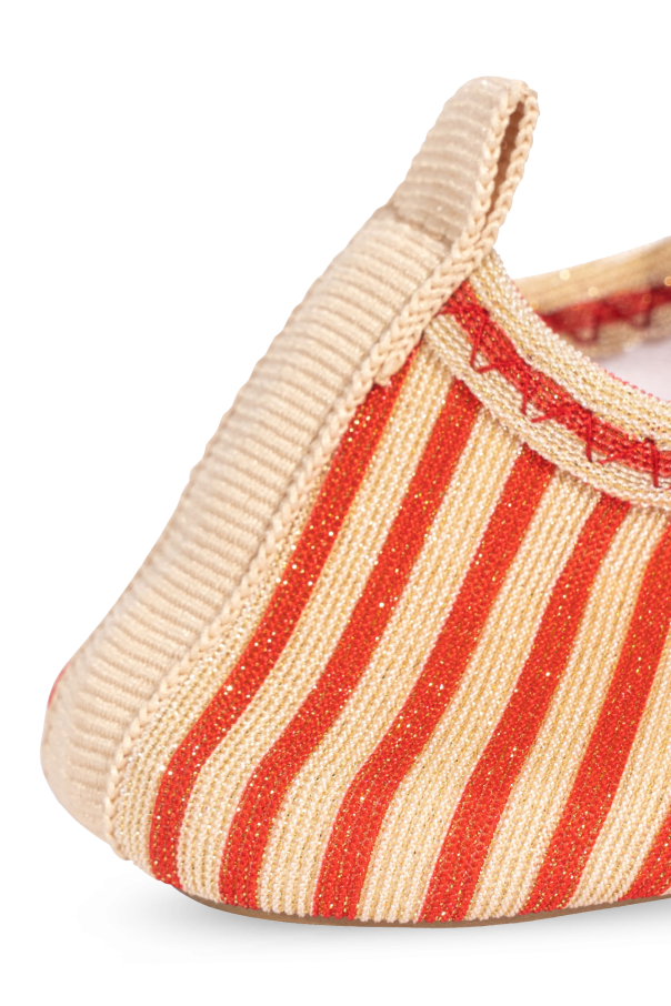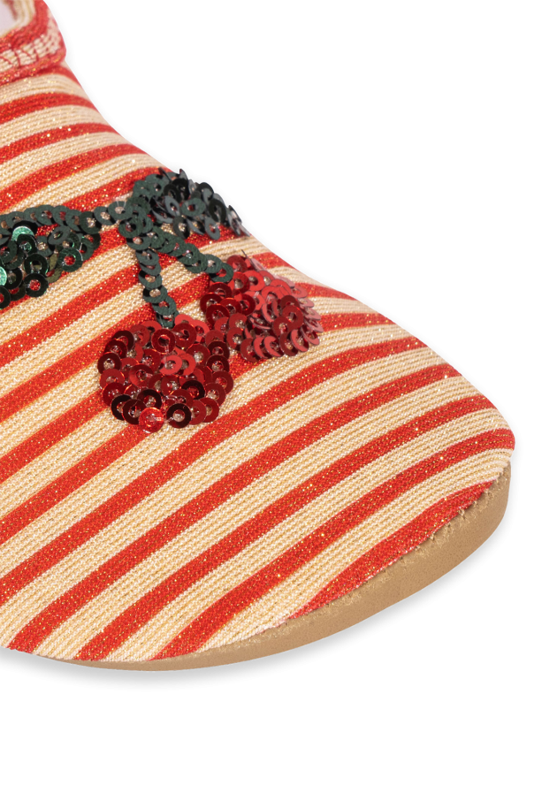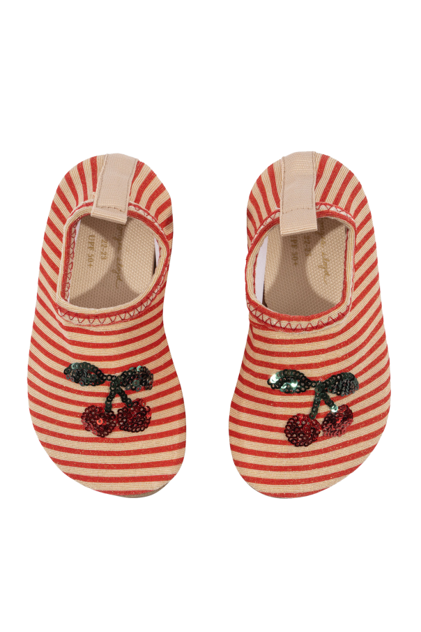 Cream and red ‘Jade’ slip-on swim shoes from Konges Slojd. Made of fabric with a UPF 50+ protection factor, this pair features a cherry motif embellished with sequins, a pull strap at the back and a flexible rubber sole in brown.