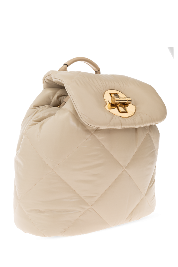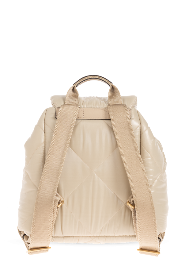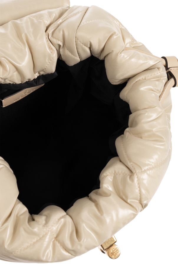Beige ‘Puf’ quilted backpack from Moncler. This design secures via a logo-shaped twist fastener and features a half-round handle, adjustable shoulder straps, antiqued gold-tone metal hardware and a drawstring-cinched interior with one compartment and one slip pocket.