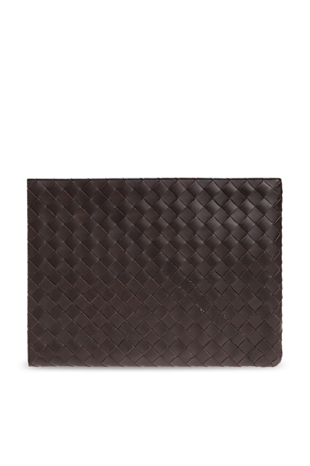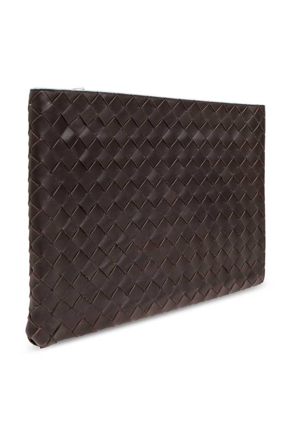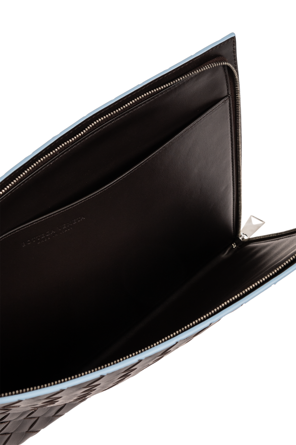 Dark brown and blue Intrecciatto document case from Bottega Veneta. Made of the brand’s signature Intreccio leather, this design features a zip fastening, silver-tone metal hardware and one internal compartment with one slip pocket.