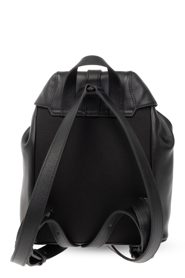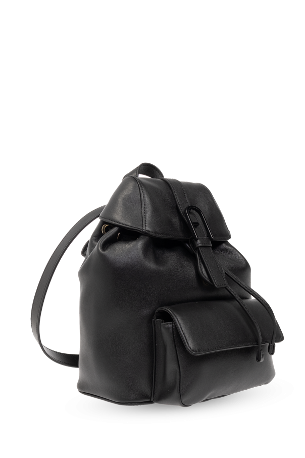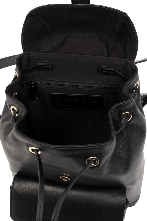Black ‘Flow Small’ backpack from Furla. Made of leather and fabric, this design features a magnetic snap and drawstrings, logo detail, pocket with a magnetic snap, half-round handle, adjustable shoulder straps, gold-tone metal hardware and one internal compartment with one zip pocket.