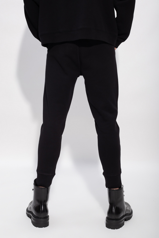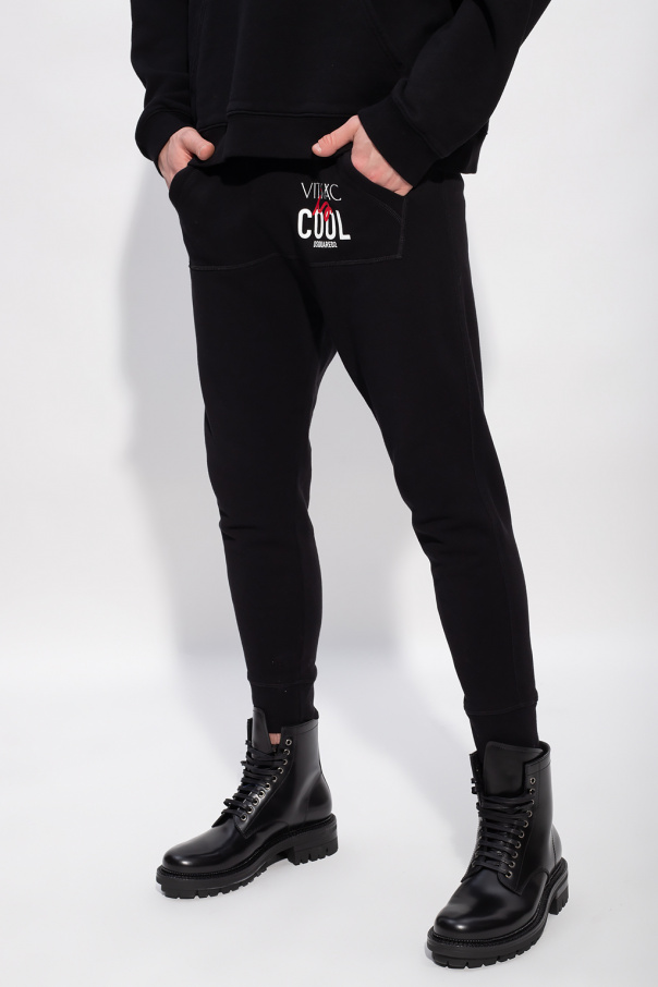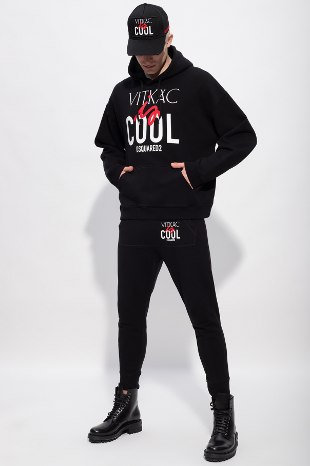 Black sweatpants from Dsquared2. Crafted from cotton, this pair falls down with tapered legs and features an elasticated waistband and cuffs, two side seam pockets and a white and red graphic print with the brand's logo. Item designed to celebrate the 10th anniversary of VITKAC.