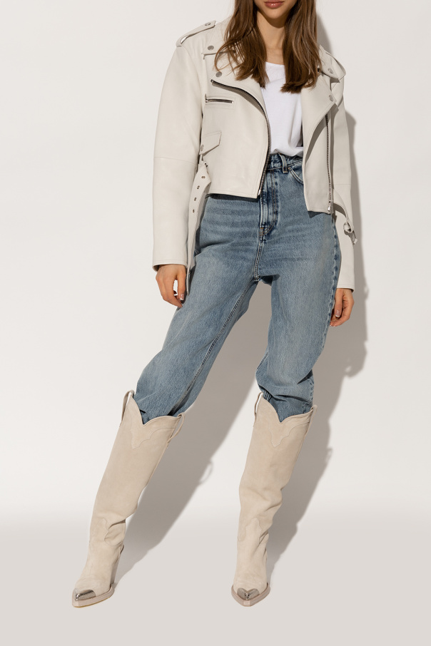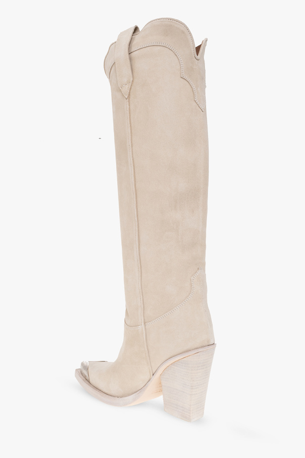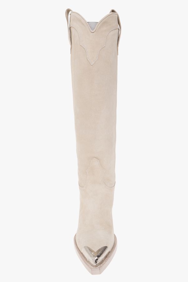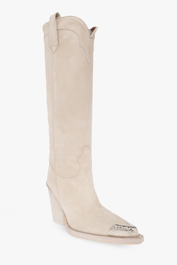Cream ‘El Dorado’ heeled boots from Paris Texas. Crafted from calf suede, this model sits on a cream leather sole and features a slip-on silhouette and a tapered toe accentuated with engraved hardware in silver-tone.