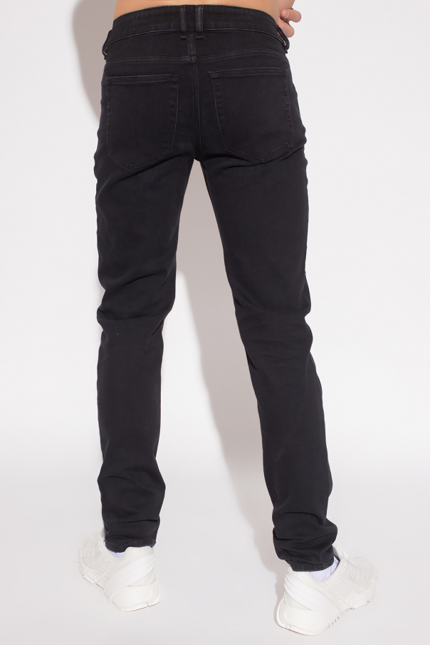 Black ‘1979 SLEENKER’ skinny fit jeans from Diesel. This low rise design features a zip and button closure, logo patch, three front pockets, two back pockets and tapered legs.