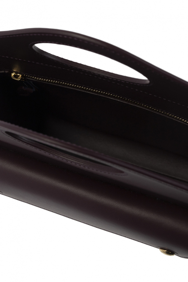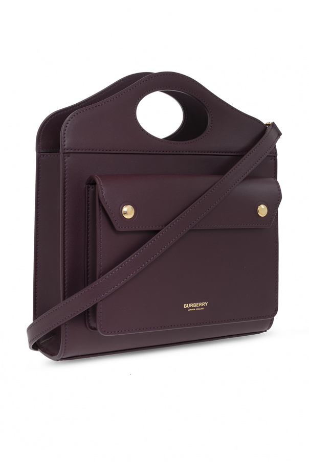 Maroon ‘Mini Pocket’ handbag from Burberry. Made of leather, this design features a frontal pocket with magnetic snaps and a gold-tone logo, two half-round handles, a detachable and adjustable shoulder strap, gold-tone metal hardware and one internal compartment with a zipped pocket.