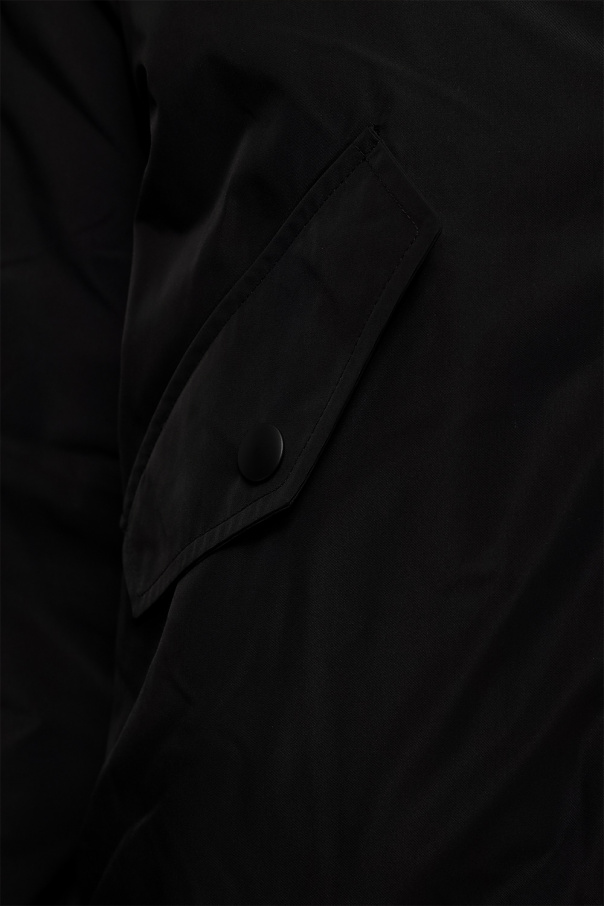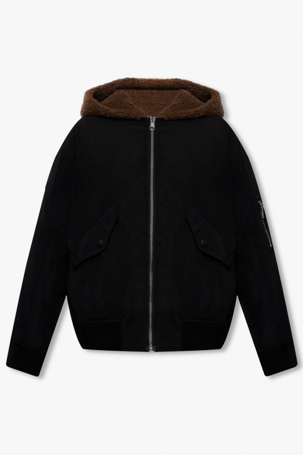 Reversible insulated hooded jacket in black and brown from Yves Salomon, the ‘Meteo’ line. Fastened with a silver-tone metal zip, this garment features a wool hood, ribbed trims at the hem and cuffs. One side is black and has two snap-fastened pockets. The other side is made of wool and complete with two front pockets.