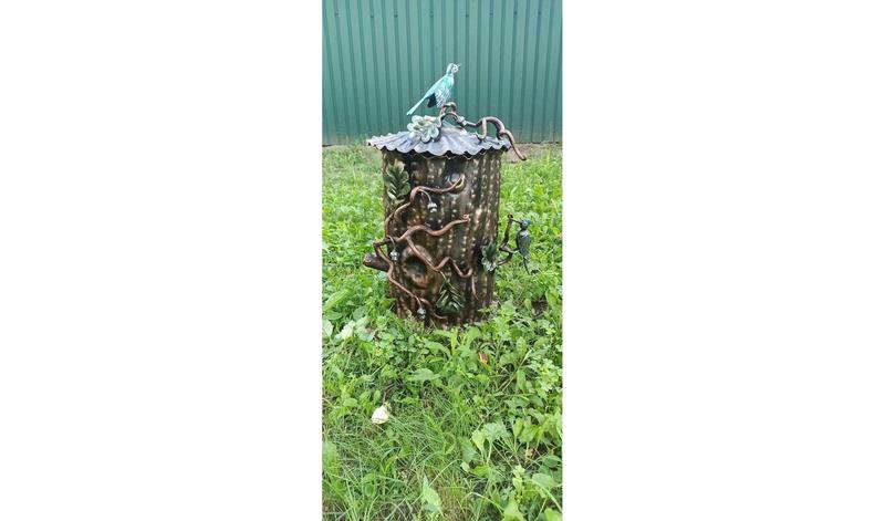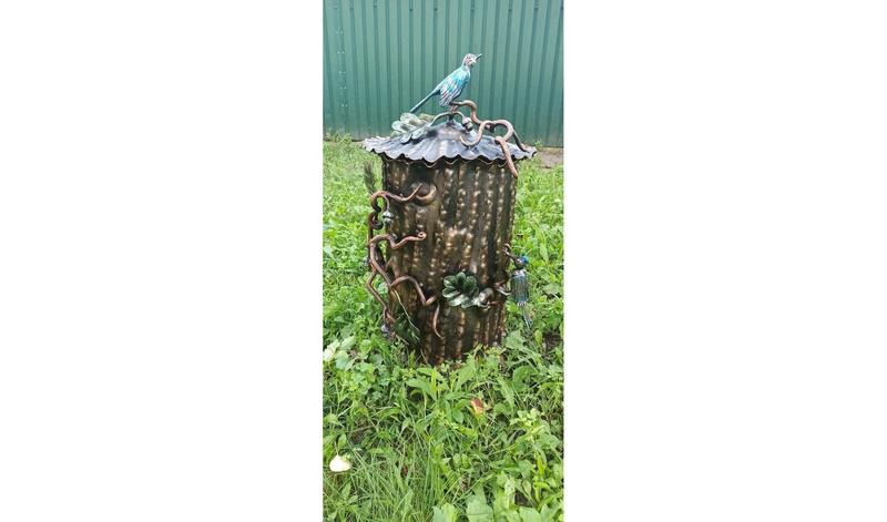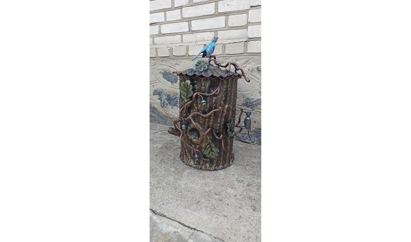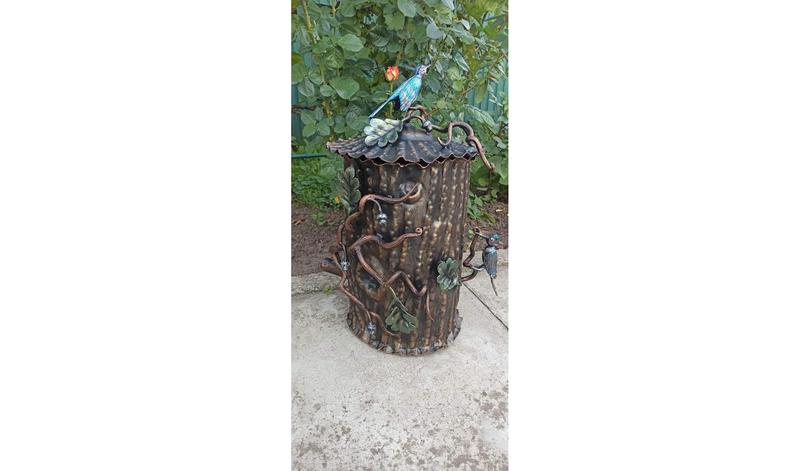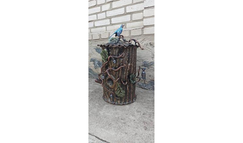 Это кованое мусорное ведро ручной работы с декором дуба, грибами и бабочкой,