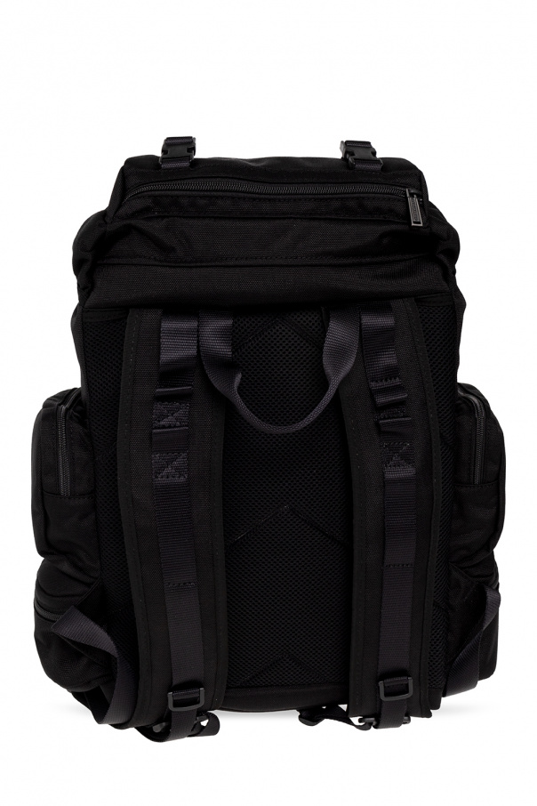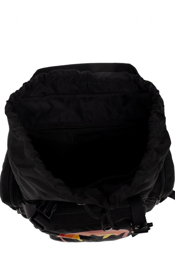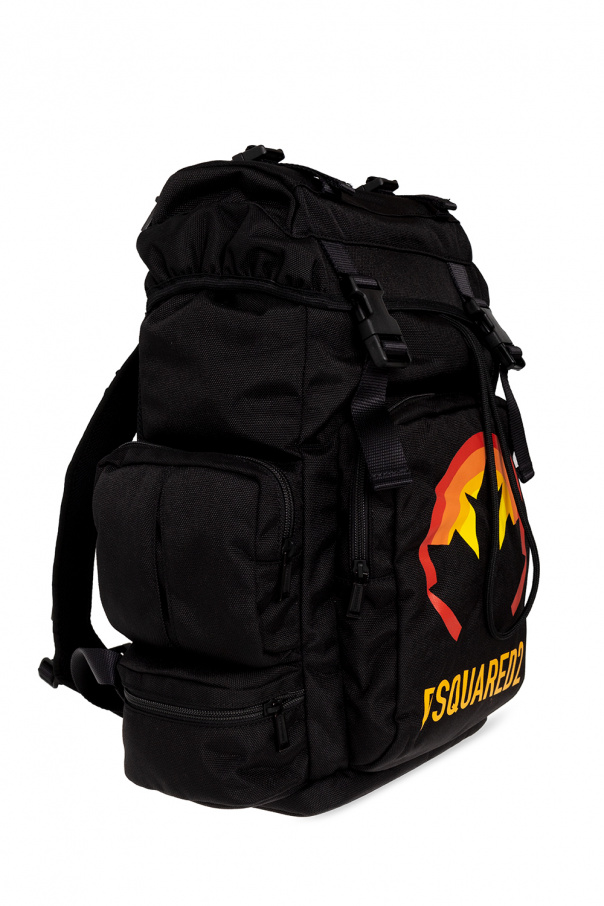 Black backpack from Dsquared2. This model features a snap-fastened flap, orange, red and yellow logo print, six zip pockets, half-round handle, adjustable shoulder straps with a snap-fastened strap, black metal hardware and one internal compartment with drawstrings and one zip pocket.
