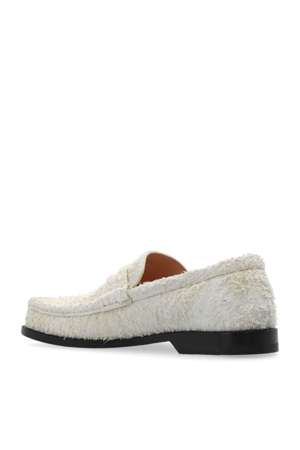 Light grey ‘Campo’ loafers from Loewe. Made from suede, this model sits on a beige leather sole and features a cut-out strap on the front.