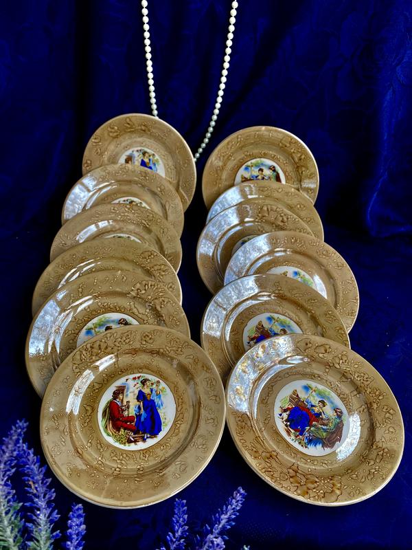 Комплект включает 12 тарелок, с разными сценами (5 и 7). Цену указана за все!Состояние: ИдеальноеЦвет:- Коричневый