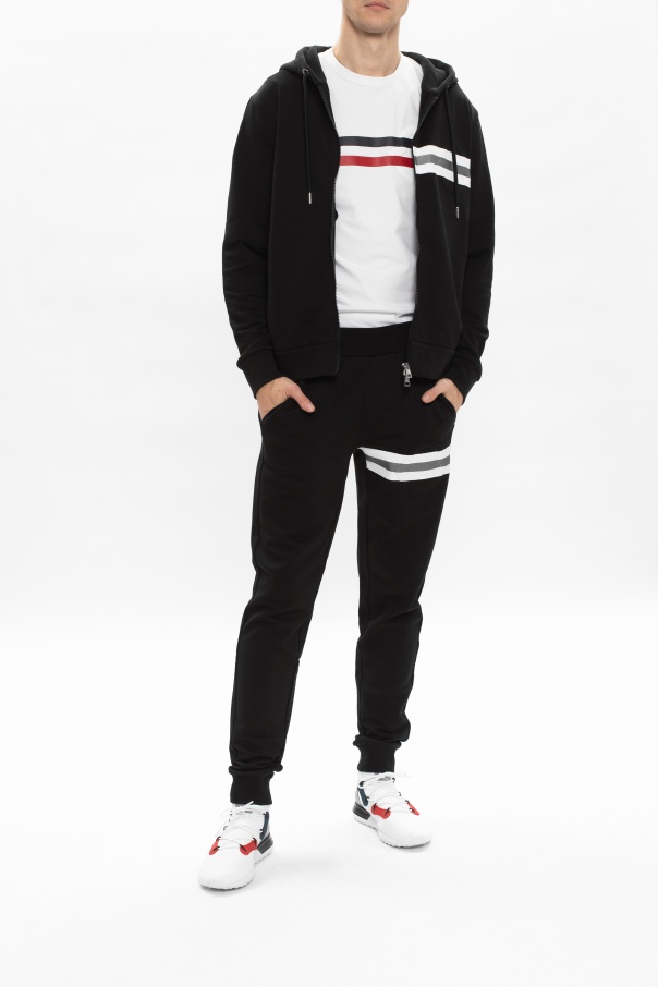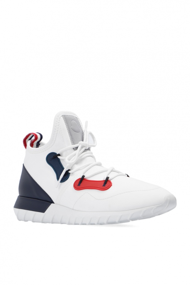 White ‘Emilien II’ high-top sneakers from Moncler. Trimmed with leather, this lace-up design features a logo print, grosgrain pull tab and white rubber sole.