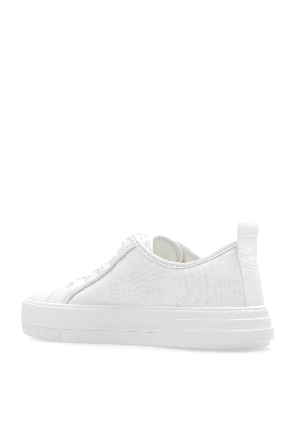White ‘Evy’ sneakers from Michael Michael Kors. Made from fabric and faux leather, this lace-up model sits on a white rubber sole and showcases a logo patch for brand recognition.