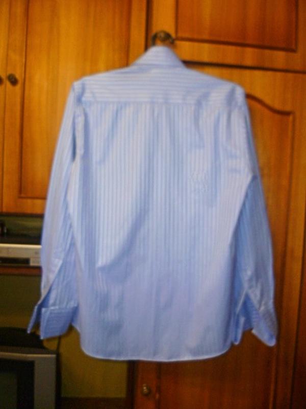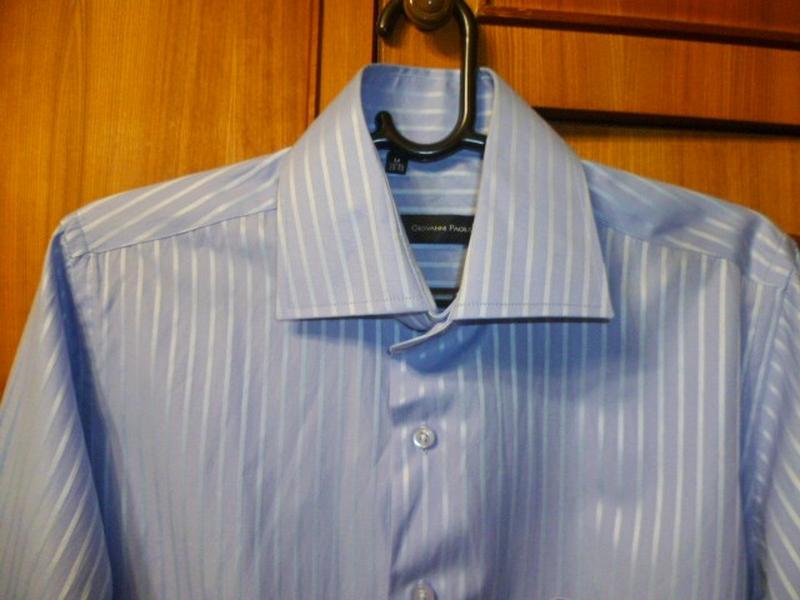 Красивая фирменная рубашка благородного голубого цвета. Очень качественная ткань и пошив. Ткань мягкая ближе к тонкой. Воротник и манжеты жесткие, как накрохмаленные. Манжеты под запонки. Покрой чуть приталенный, низ закруглен. Состояние идеальное новой вещи, без дефектов, следы носки не заметны.