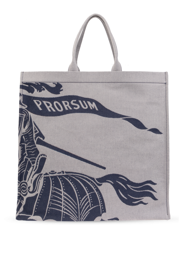Grey and navy blue shopper bag from Burberry. Made from cotton, this design showcases graphic embroidery with the brand's ‘Equestrian Knight’ motif, two half-round handles and one internal compartment.