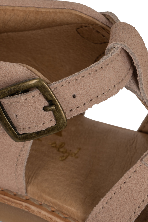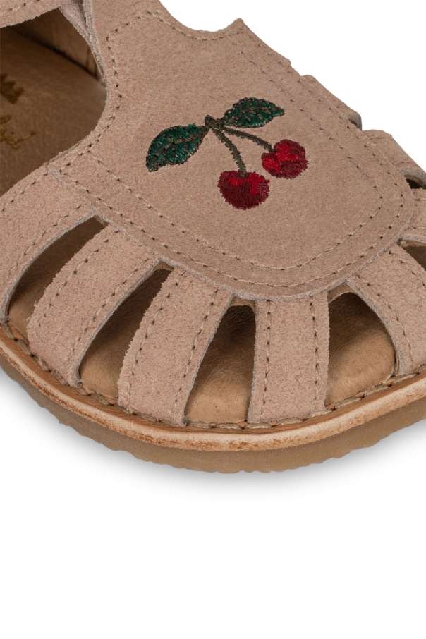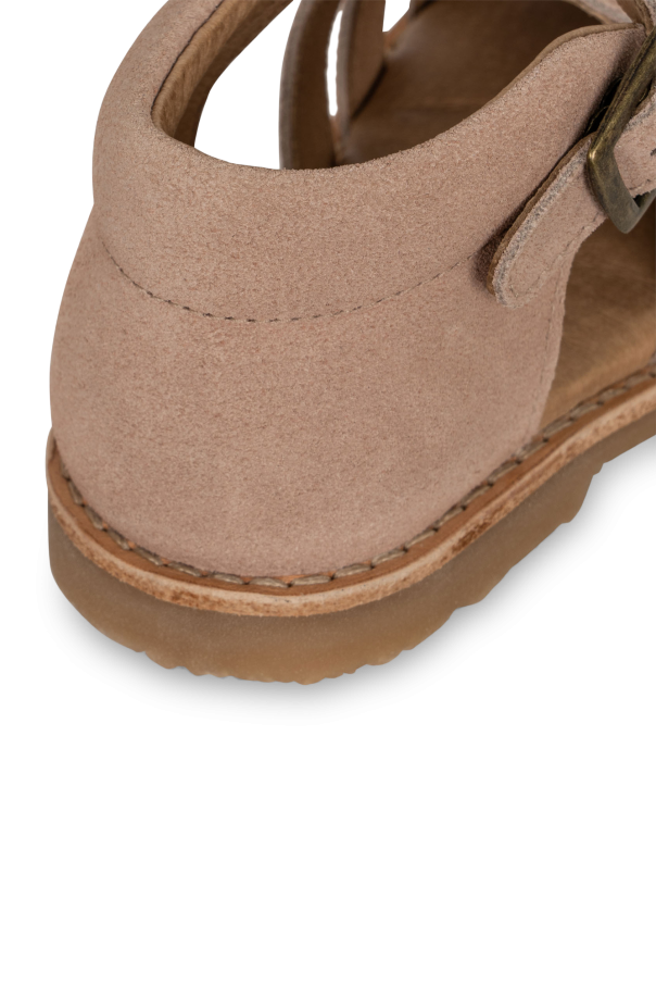 Introducing the 'Esmaa' Suede Shoes by Konges Sløjd, a testament to the harmonious blend of comfort and elegance tailored for the discerning younger clientele. These exquisite sandals, crafted from high-quality suede, exude a soft, sandy hue that evokes the timeless beauty of the natural world. The classic sandal silhouette is reimagined with multiple straps gracefully encasing the foot, leading to an antique gold buckle closure at the ankle that adds a touch of vintage charm. The flat sole, mimicking cork, complements the shoes' natural aesthetic, while the embroidered cherry motifs on the front and the subtle designer logo on the strap infuse them with a unique character. Every stitch speaks volumes of the meticulous craftsmanship that defines Konges Sløjd's commitment to quality. The interior and exterior layers of leather ensure durability and soft comfort, making these shoes not just stylish, but also a practical choice for children's delicate feet. Why Purchase the 'Esmaa' Suede Shoes? Exclusively designed by Konges Sløjd, embodying elegance and comfort. Crafted from premium suede for a luxurious feel and durability. Unique details such as embroidered cherry motifs and an antique gold buckle that add distinctiveness. Soft leather interior for unmatched comfort and soft rubber sole for flexibility during play. Artisanal attention to detail, showcasing handcrafted exclusivity.