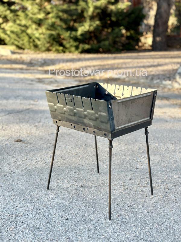 разбирается. Длина-37см, ширина-28см, высота ножек-40см, высота стенок-15см.Стенки мангала не деформируются при нагреве, при условии, что раскаленный
