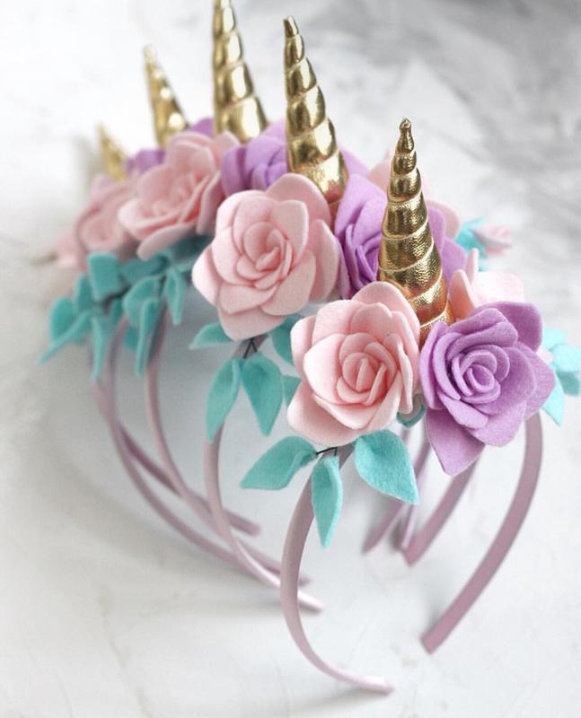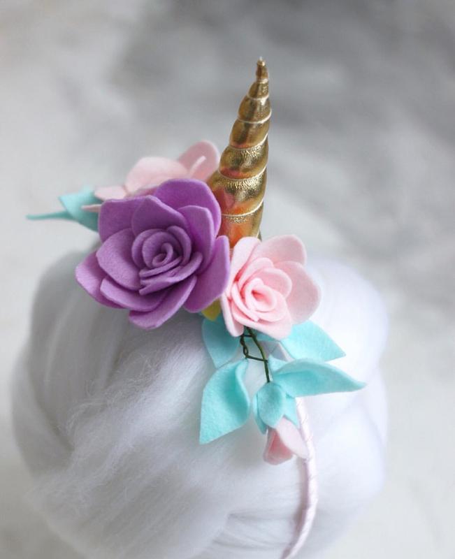 Нежный обруч для волос из мягкого фетра в пастельных тонах. Аппликация в стиле «Единорожки» с золотистым рогом и мерцающими стразами украшена нежными розовыми и лиловыми цветами. Универсальный размер, подойдет для девочек любого возраста.