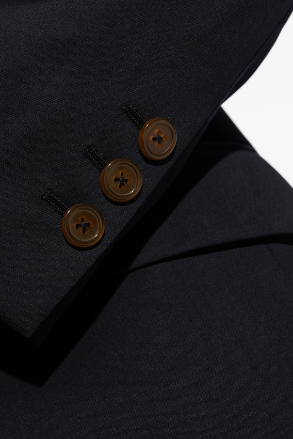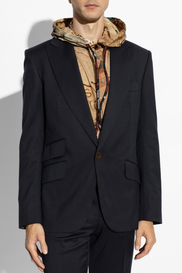 Introducing an embodiment of sartorial elegance and sophistication — the Vivienne Westwood Navy Wool Blazer. Crafted from the finest 100% Virgin Wool, this blazer epitomizes luxurious comfort and durability. The inner lining, made from 100% Viscose, promises a smooth and comfortable fit, ensuring ease of movement and a refined silhouette. This single-breasted blazer features a classic two-button closure and a distinctive collar with sleek lapels, presenting a timeless design. The contrasting inner lining and designer label accentuate its exclusivity, while the exterior boasts a polished navy hue that complements any ensemble with an air of grace and versatility. Attention to detail is evident in the meticulously designed cuff buttons in contrasting colors, a hallmark of Vivienne Westwood's renowned craftsmanship. Equipped with four functional pockets — one welt chest pocket and three flap side pockets — this blazer combines practicality with style. The back vent enhances mobility, ensuring comfort without compromising on elegance. Why Purchase This Product? Exquisite Material: Made from 100% Virgin Wool with a Viscose lining for ultimate comfort and longevity. Timeless Design: Classic navy color, two-button closure, and distinctive lapels offer a polished look. Functional Elegance: Four pockets and decorative cuff buttons blend utility with style. Renowned Craftsmanship: A signature piece from the iconic Vivienne Westwood collection.