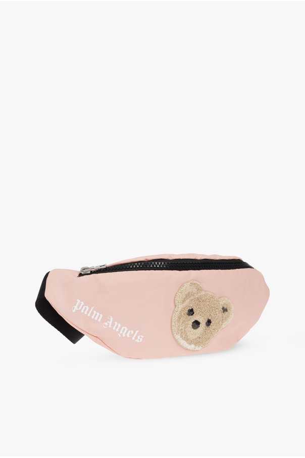 Pinkish orange belt bag from Palm Angels Kids. Fastened with a zip, this design features a furry teddy bear motif, logo print, adjustable belt, one internal compartment and silver-tone metal hardware.
