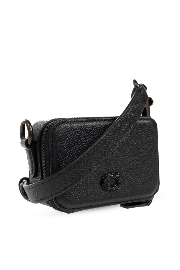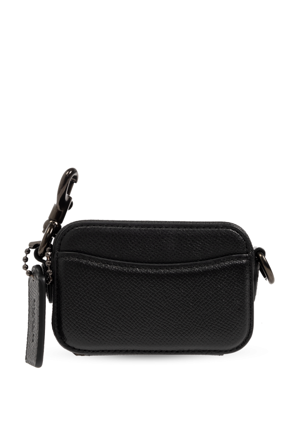 Black card holder from Coach. Made of leather, this design features zip-around fastening, logo detail, back pocket, detachable and adjustable strap, one internal compartment and black metal hardware.