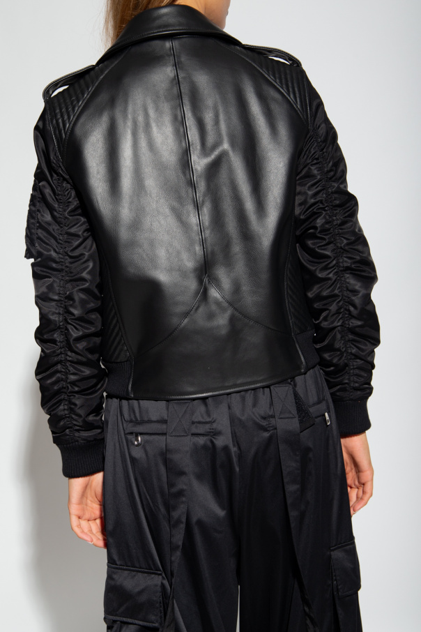 Black biker jacket from Dolce & Gabbana. Made of leather and fabric, this garment features three front zip pockets, decorative snap-fastened flap, epaulette details, four slip pockets and one zip pocket on the sleeve as well as silver-tone branded metal hardware and ribbed trims at the hem and cuffs.