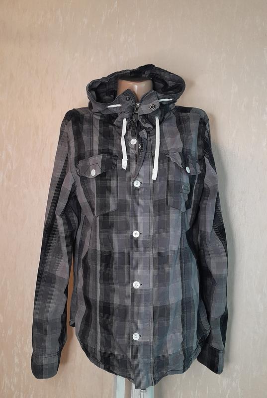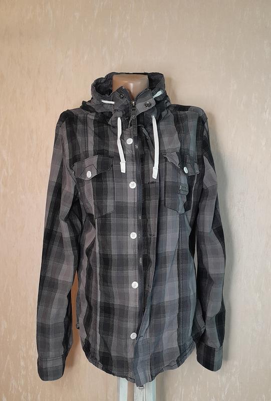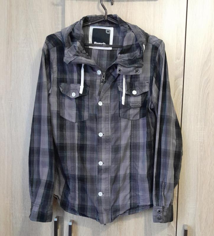 Стильная мужская рубашка с капюшоном Bench в клетку, хорошего качества, 100% коттон, застегивается на молнию и на кнопки, капюшон регулируется шнуровкой, в отличном состоянии, размер 46-48