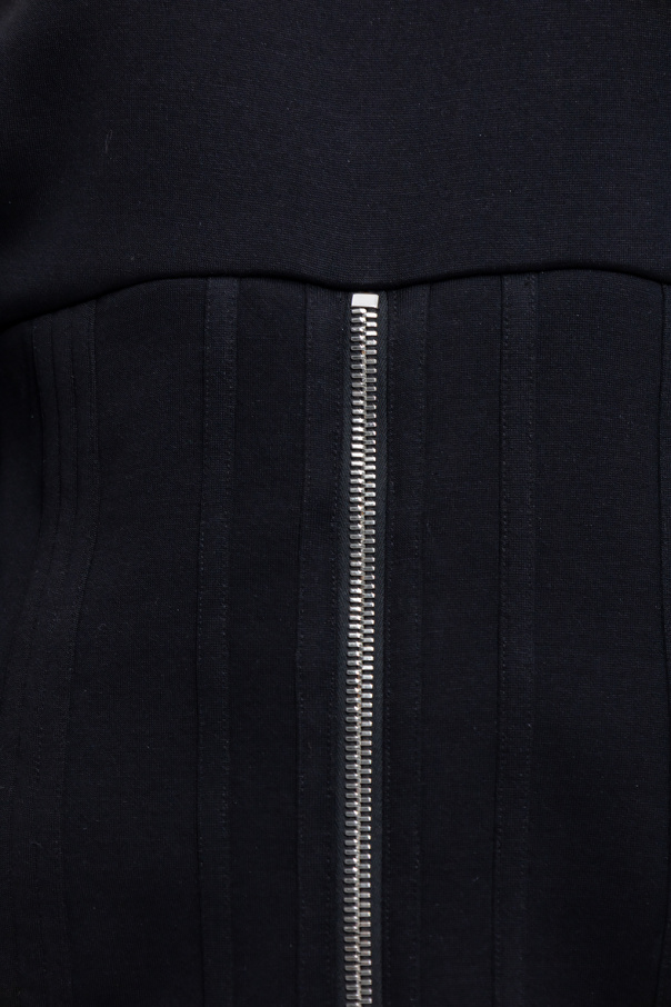 Black dress from Alexander McQueen. Crafted from cotton, this style features an elasticated round neck and long sleeves, a front zipper, back logo embroidery and a skin-tight bottom accentuated with decorative stitching details.