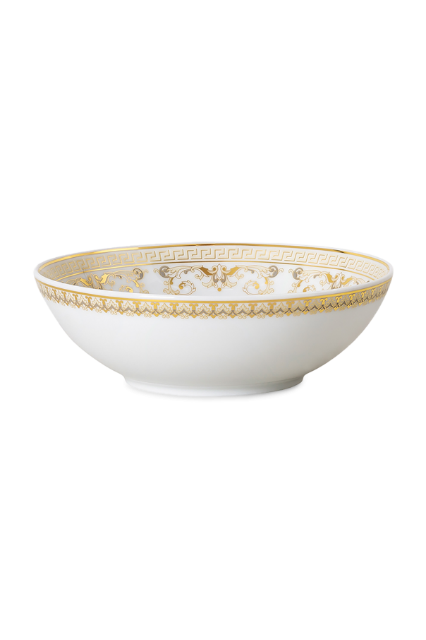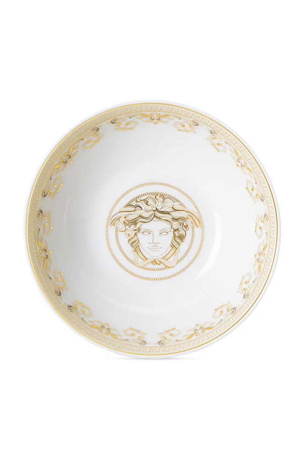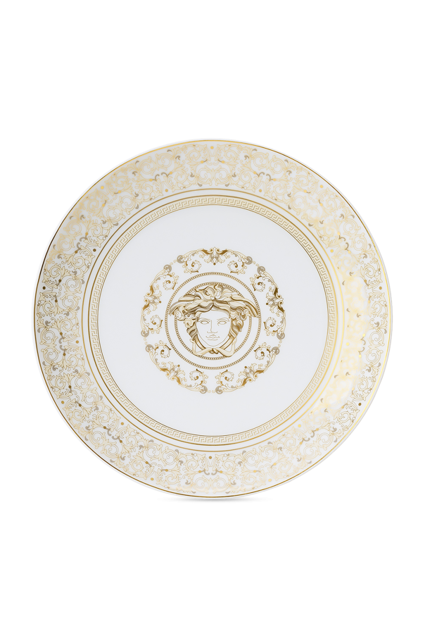 Introducing the Versace Kids x Rosenthal exclusive porcelain collection, a sublime fusion of opulence and sophistication. Designed in collaboration with the esteemed Rosenthal, this collection epitomizes luxury with its pristine white backdrop adorned with resplendent gold embellishments. The plate features an exquisite gold motif, prominently displaying the iconic Medusa head at its center, bordered by delicate golden ornaments. The bowl, in harmonious design, reveals the Medusa at its base, with its rims graced by intricate gold detailing. Completing the trio, the cup boasts a white body embellished with golden patterns, including the Medusa, and a gold-accented handle that exudes elegance. This collection seamlessly blends classic white with luxurious gold, a hallmark of the Versace brand. Why Choose This Product? Exquisite design from the renowned Versace brand. Elegant combination of white and gold for a luxurious aesthetic. Iconic Medusa motifs that add a touch of sophistication. Perfect for elevating any dining experience.