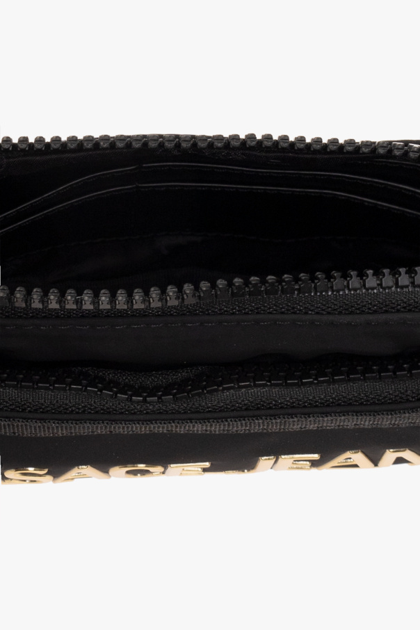 Black belt bag from Versace Jeans Couture. Emblazoned with a gold-tone rubber logo patch, this design features a zip fastening, a zip pocket on the front, an adjustable strap with a buckle and three separate compartments with six card slots inside.