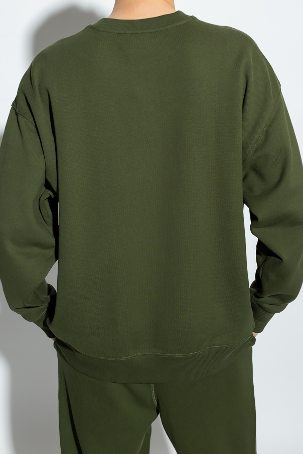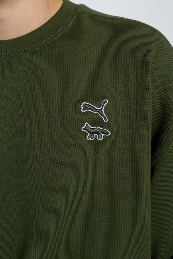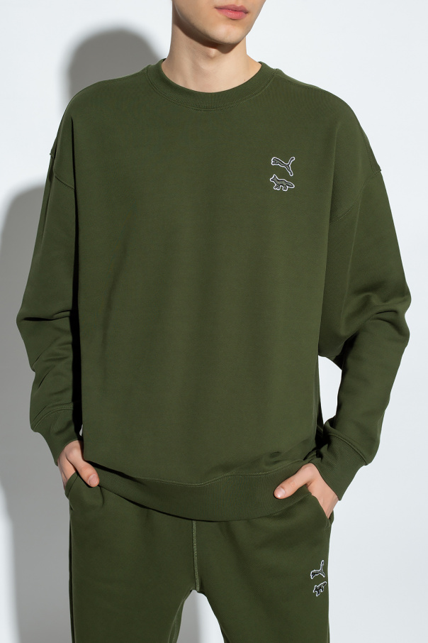 Green crewneck sweatshirt from Puma x Maison Kitsuné. Crafted from cotton, this style showcases two green and white logo patch and ribbed trims on the bottom hem, cuffs and sides.