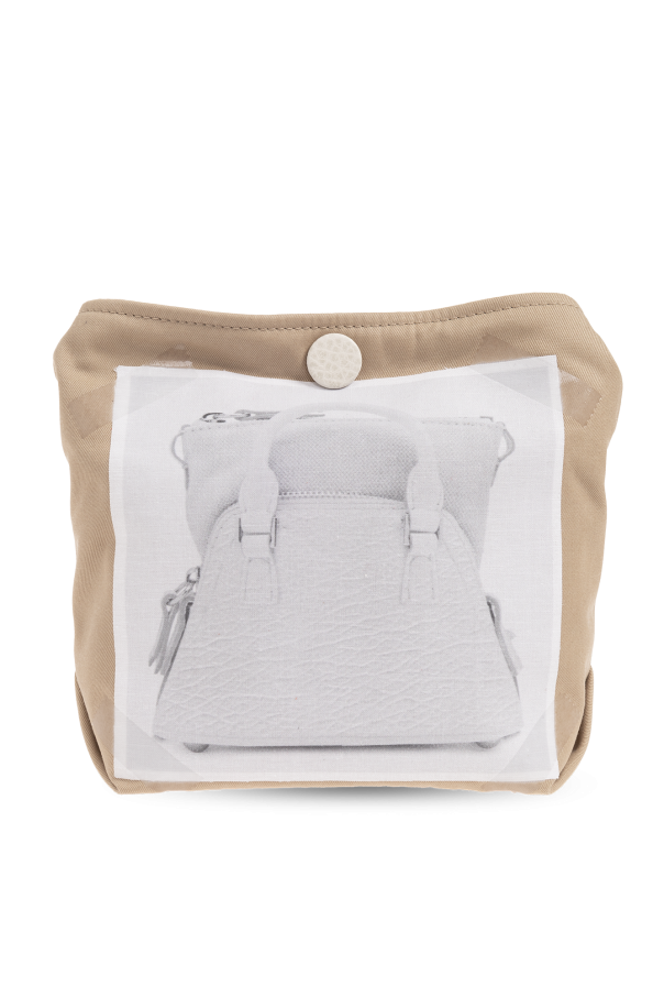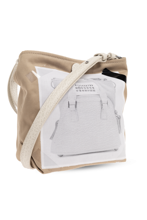 Beige shoulder bag from Maison Margiela. Made of fabric, this model features a snap closure, bag print, adjustable shoulder strap, silver-tone metal hardware and one internal compartment with one slip pocket.