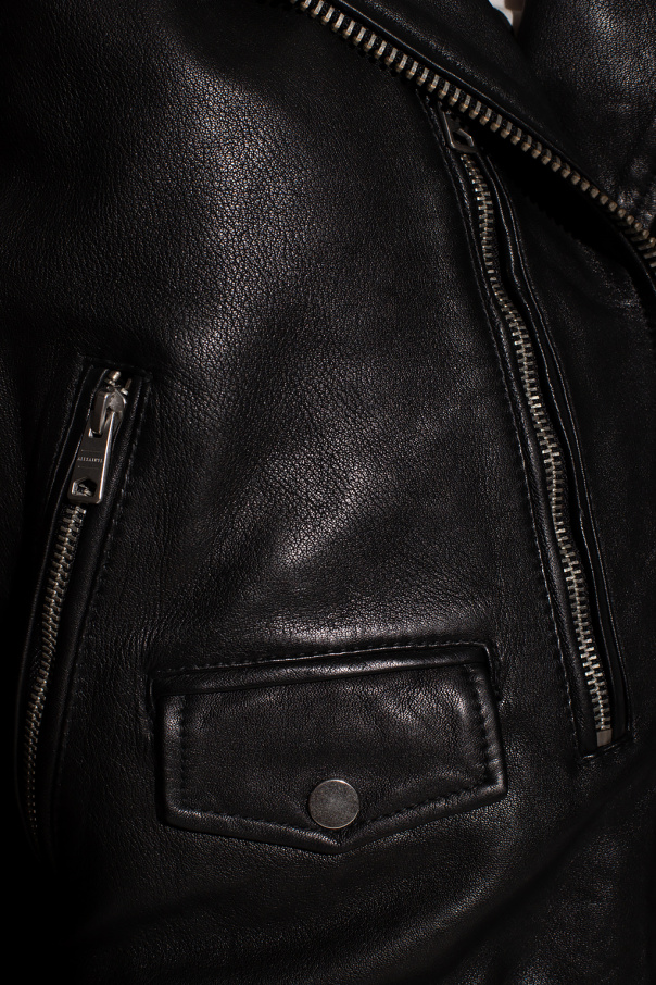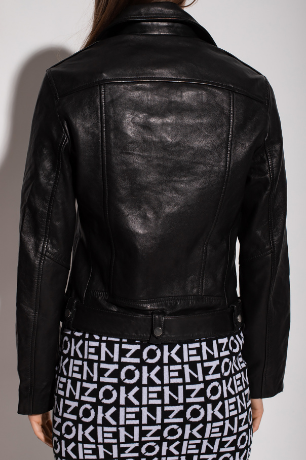 Black ‘Dren’ jacket from AllSaints. Made of sheep leather, this style features a zip fastening, a buckle belt at the waist, three zipped pockets and long sleeves.