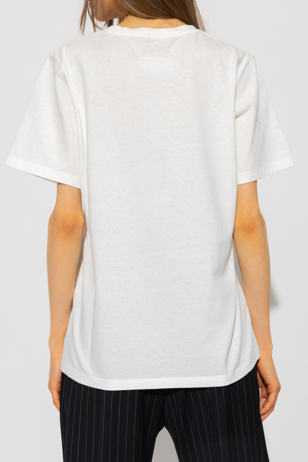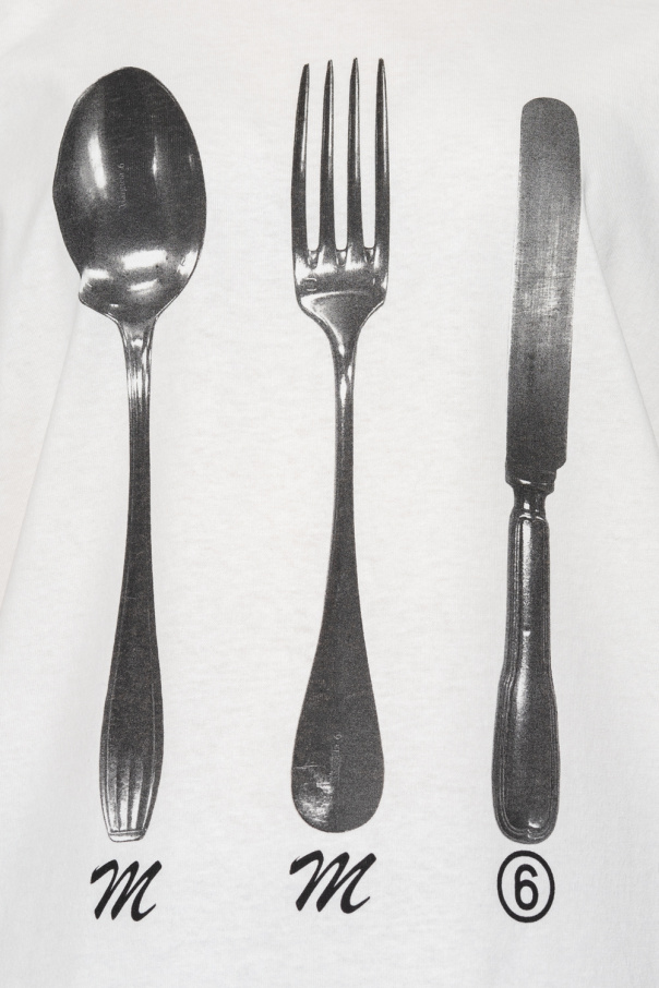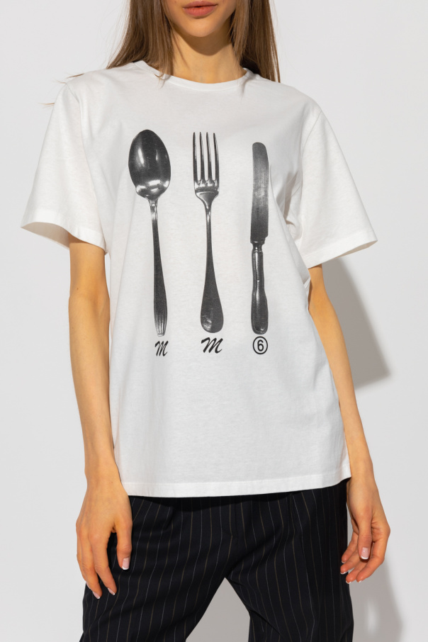 White crewneck T-shirt from MM6 Maison Margiela. Made of cotton with a relaxed silhouette, this style features short sleeves, an elasticated collar and a graphic print with cutlery and the brand's logo.