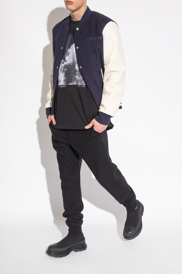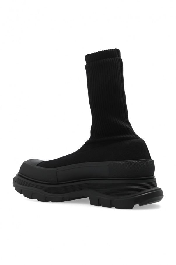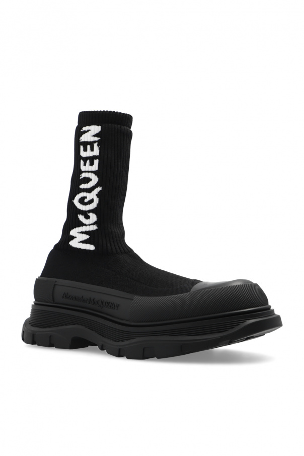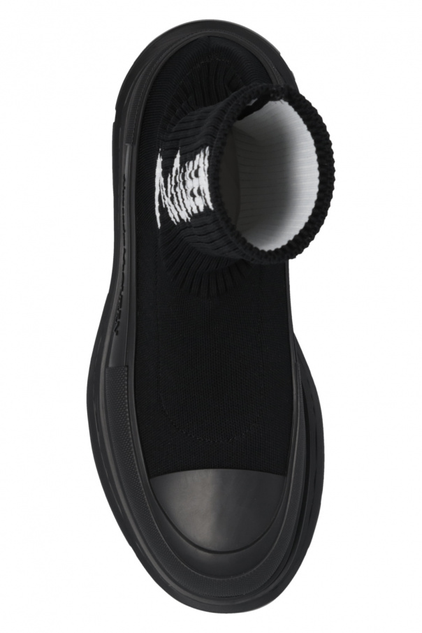 Black sock sneakers from Alexander McQueen. Resting on a black rubber sole, this pair features a white logo embroidery, raised logo and rubber trims.