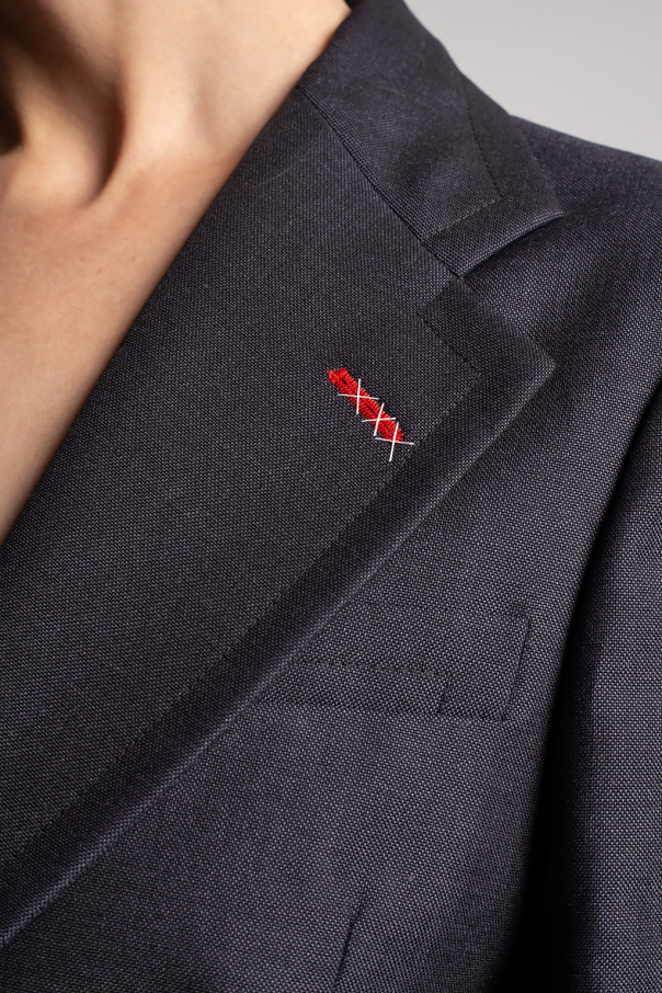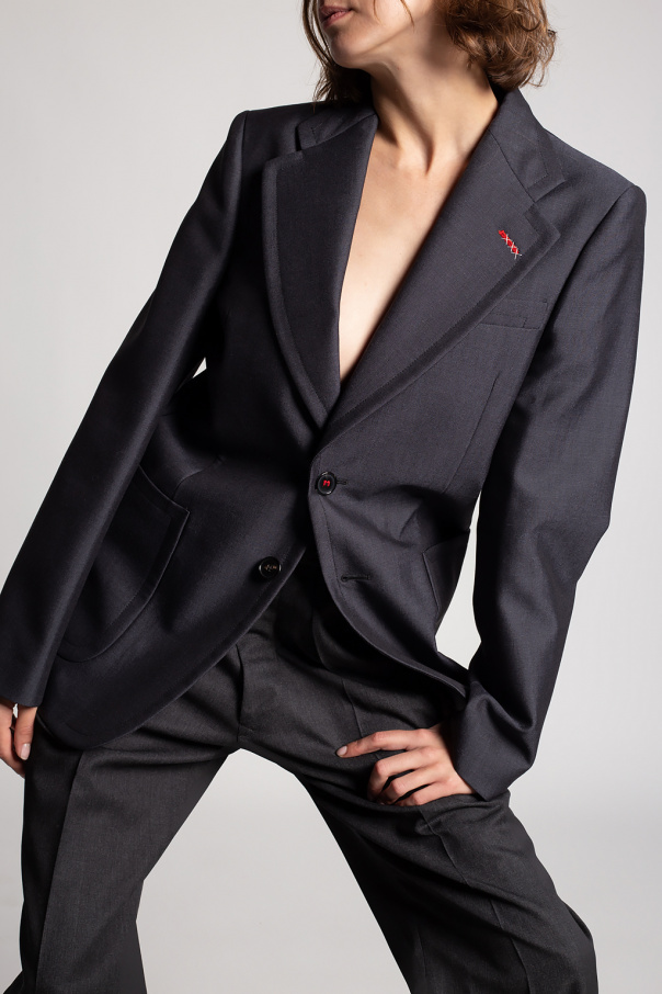 Black and grey blazer from Maison Margiela. Made of wool, this style fastens via buttons and features notch lapels, long sleeves, three pockets on the front and an embroidered logo on the back.