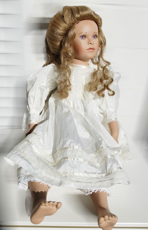 Фарфоровые головка, ручки до локтей, ножки до колен. Головка поворотная. В ручках проволочный каркас, можно придавать рукам любое положение, ножки же мягкие, за счет чего можно посадить в любой позе.Паричок густой( не натуральный), волосы собраны в хвостик с помощью банта.Реснички густые, большие глаза фиалкового цвета. Фарфор в отличном состоянии, на шейке клеймо мастера.Тело без запаха, чистое.Кукол всего 500 штук. номер 140 из 500